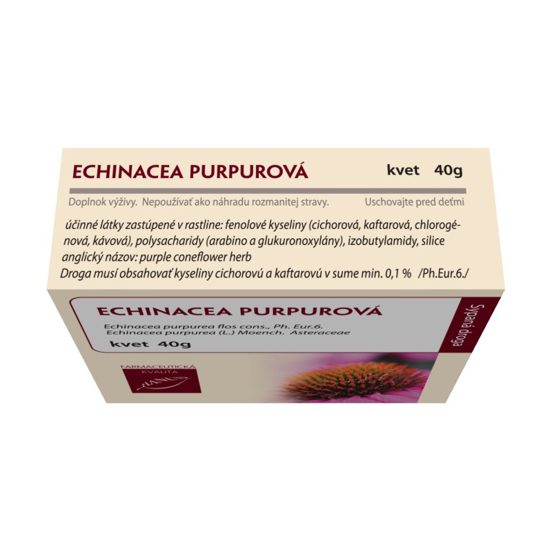 Účinné látky v droge: fenolové kyseliny, polysacharidy (arabino a glukuronoxylány), izobutylamidy Európsky liekopis: Echinaceae purpureae flos (Ph.Eur.6) Droga musí obsahovať: suma kyselina cichorová, kyselina kaftarová min. 0,1 %