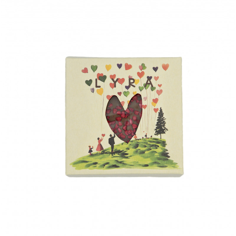 Mliečna čokoláda (99%)(cukor, kakaové maslo, plnotučné sušené mlieko, kakaová hmota, emulgátor: slnečnicový lecitín, vanilkový extrakt); posyp lyofilizovaná malina (1%).