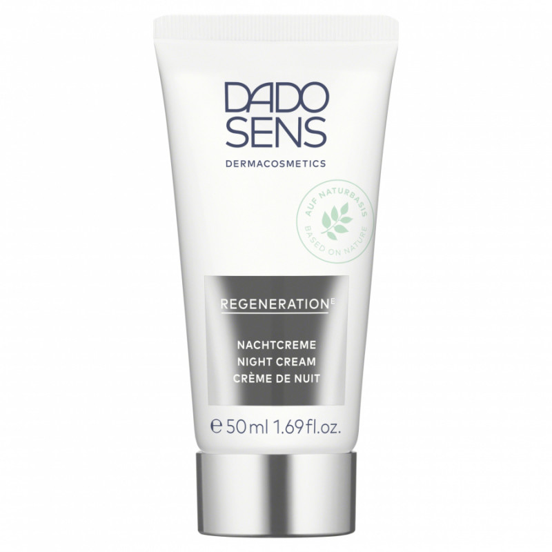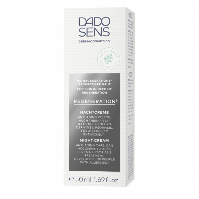 Nočný krém od certifikovanej prírodnej dermokozmetiky DADO SENS pre každého, koho pleť (už viac) neznesie bežné parfumované série. Dodáva citlivej pleti potrebnú vlhkosť, čím zmierňuje vrásky. Pleť po aplikácii pôsobí upokojene a má žiarivý a svieži vzhľad. REGENERATION E Nočný krém podporuje regeneráciu pokožky počas noci a predstavuje starostlivosť proti starnutiu. Obsahuje ektoínový omladzujúci komplex, biotín a výťažok z koreňa sladkého drievka. Krém je vhodným doplnkom terapeutickej starostlivosti o ekzém a psoriázu.