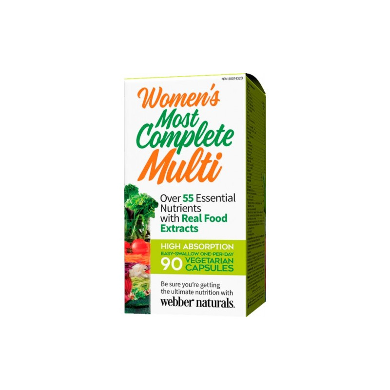 Komplex vitamínov pre ženy od spoločnosti Webber Naturals je receptúra, ktorá sa užíva jedenkrát denne a ponúka cielenú výživovú podporu pre ženy so stredne až veľmi aktívnym životným štýlom. Je vhodná pre vegetariánov, je dodávaná v ľahko stráviteľnej vegetariánskej kapsule a je vyrobená z prísad iných ako GMO. Komplex vitamínov pre ženy obsahuje odporúčanú dennú dávku vitamínov, ktoré by vám mohli chýbať, a obsahuje energizujúcu zmes superpotravín z 28 zdrojov celého ovocia a zeleniny.